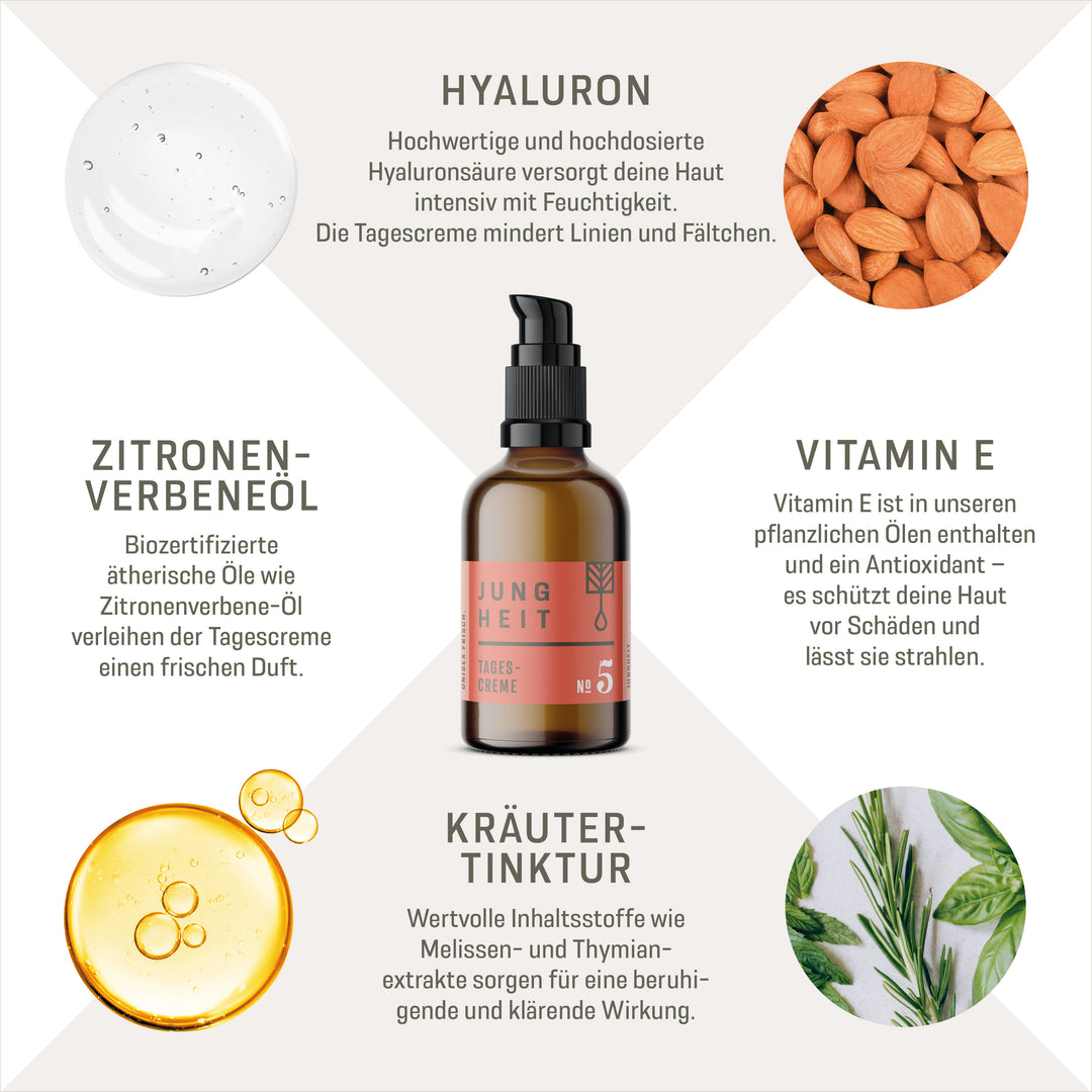 Marillenkernöl, Holundersamenöl und wertvolle, reine Hyaluronsäure versorgend dich mit allem was du für den Tag brauchst. Zink ist dein natürlicher Sonnenschutz. Los geht’s. Genieße deinen Tag.