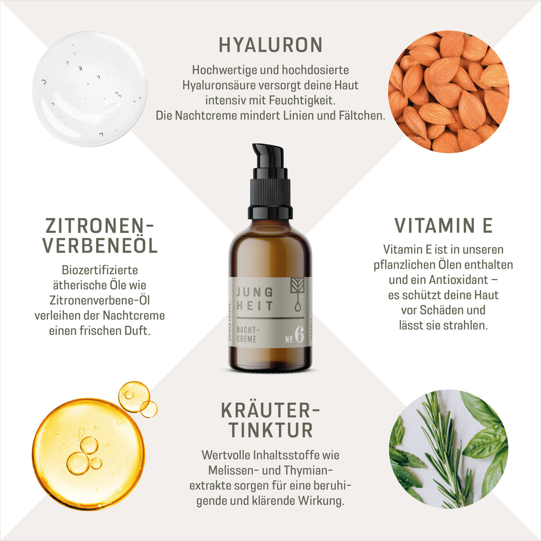 Die wichtigste Phase für deine Haut startet, wenn du schläfst. Zwei komplexe Hyaluronsäuren dringen tief in deine Haut und schaffen einen glatten Teint. Aprikosenkernöl, Holundersamenöl und Sonnenblumenöl zusammen mit Omas Kräutergeheimmischung beruhigen deine Haut. Gute Nacht.